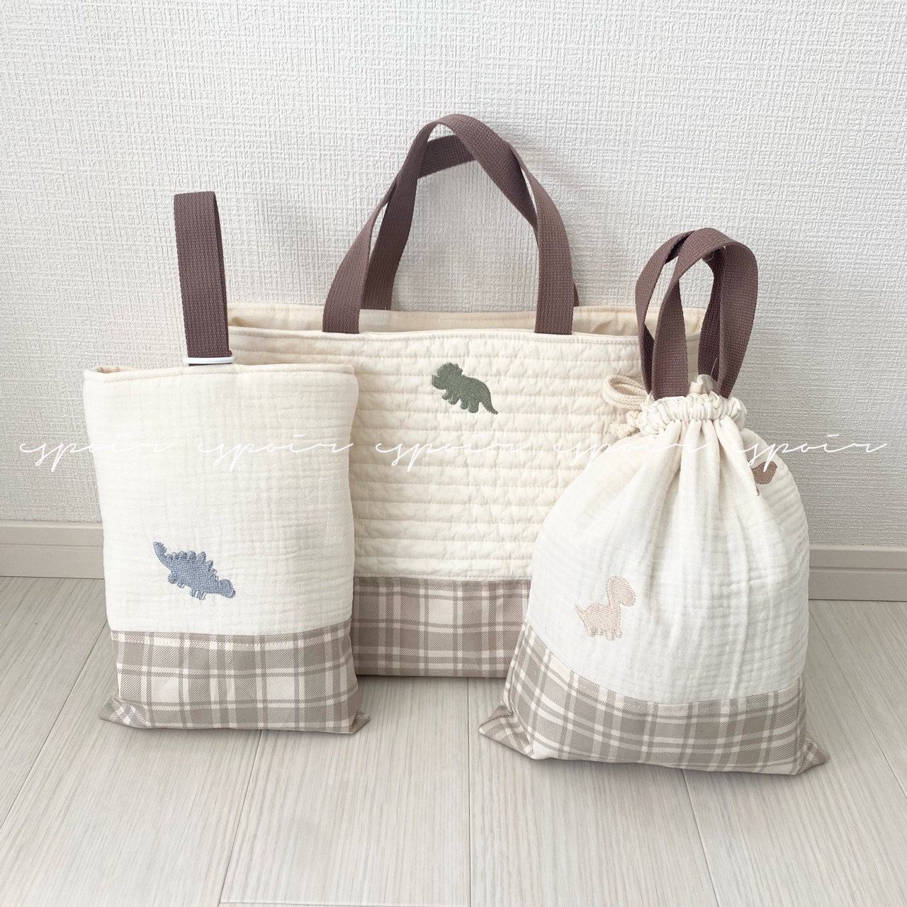 くすみカラーがベースに恐竜・ダイナソーが刺繍されており